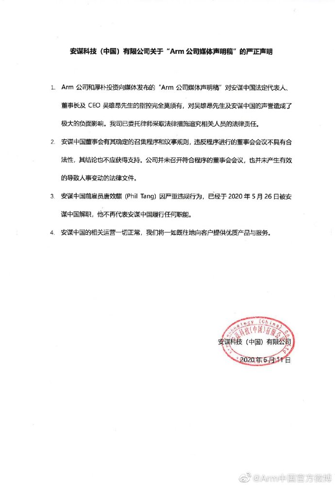 ,表明 ARM 公司和厚朴出资向媒体发布的“ARM 公司媒体声明稿”对安谋我国法定代表人、董事长及 CEO 吴雄昂先生的指控彻底莫须有,对吴雄昂先生及安谋我国的名誉造成了极大的负面影响。安谋科技(我国)有限公司表明,已托付律师采纳法令办法追查相关人员的法令责任。