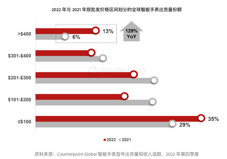 - 400 美元(约合人民币2800元)以上价格区间的出货量在 2022 年翻了一番以上,而中等价格区间的出货量同比下降;